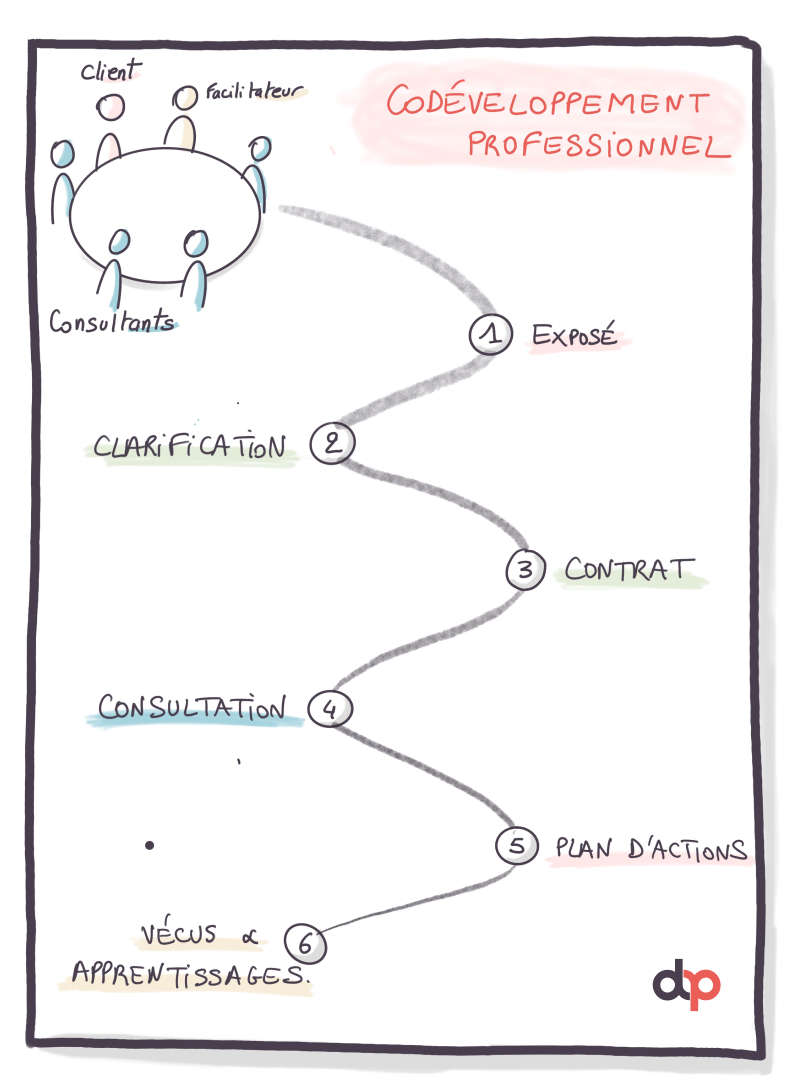 • Les “consultants” (les autres participants) l’aident par leur questionnement, leurs retours et leurs idées.